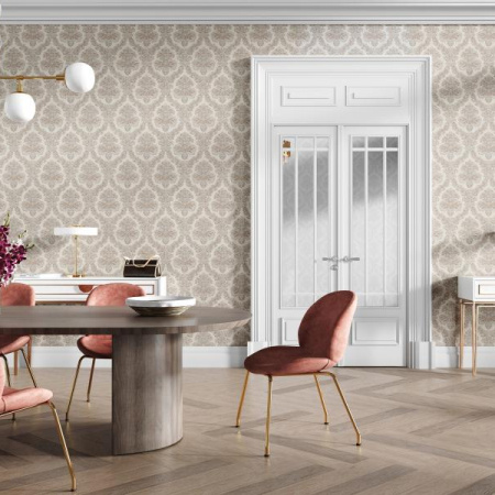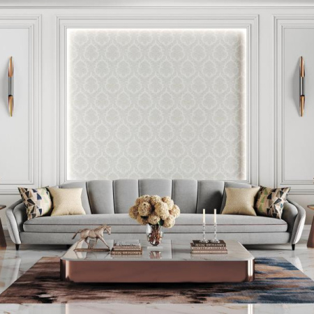 Сет «Палаццо» продолжает тему дворцовой роскоши, в мотиве которого можно увидеть распространенный для этого стиля дамасский узор с крупными цветами. Богатое тиснение придаёт им объём, а на поверхности сверкают золотые блики, за счет чего в помещении создается утонченная атмосфера для создания традиционной или же современной классики.